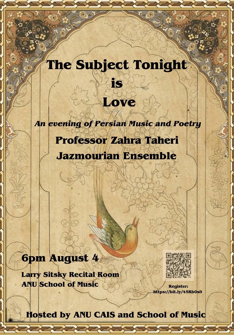 This program is the first event of our new Ensemble-in-Residency at the ANU School of Music, and highlights our collaboration with the ANU’s Centre for Arabic and Islamic Studies (CAIS), where Professor Taheri has been leading its Persian Studies for many years.